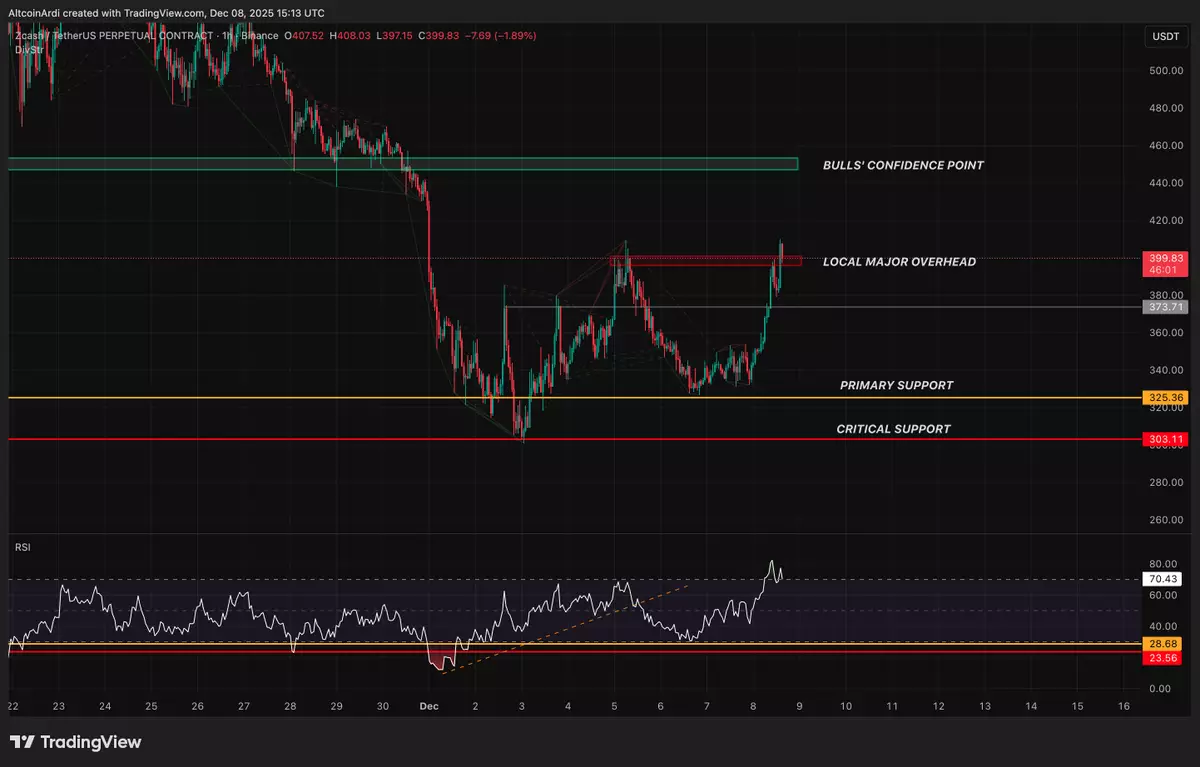 $ZEC / Zcash Don't be surprised if this cluster of longs below the current price gets wiped out. It’s the thickest liquidation band on the chart, and there’s nothing comparable above until the real magnet at ~$420. This is why trending tokens whip around so violently. The$ZEC / Zcash Here's my map of the critical levels here for Zcash as it attempts a local breakout. Price just broke through the local major overhead of $400 which keeps the higher low and higher high momentum in tact. The close here isn't convincing yet, but the chart is x.com/ArdiNSC/status…