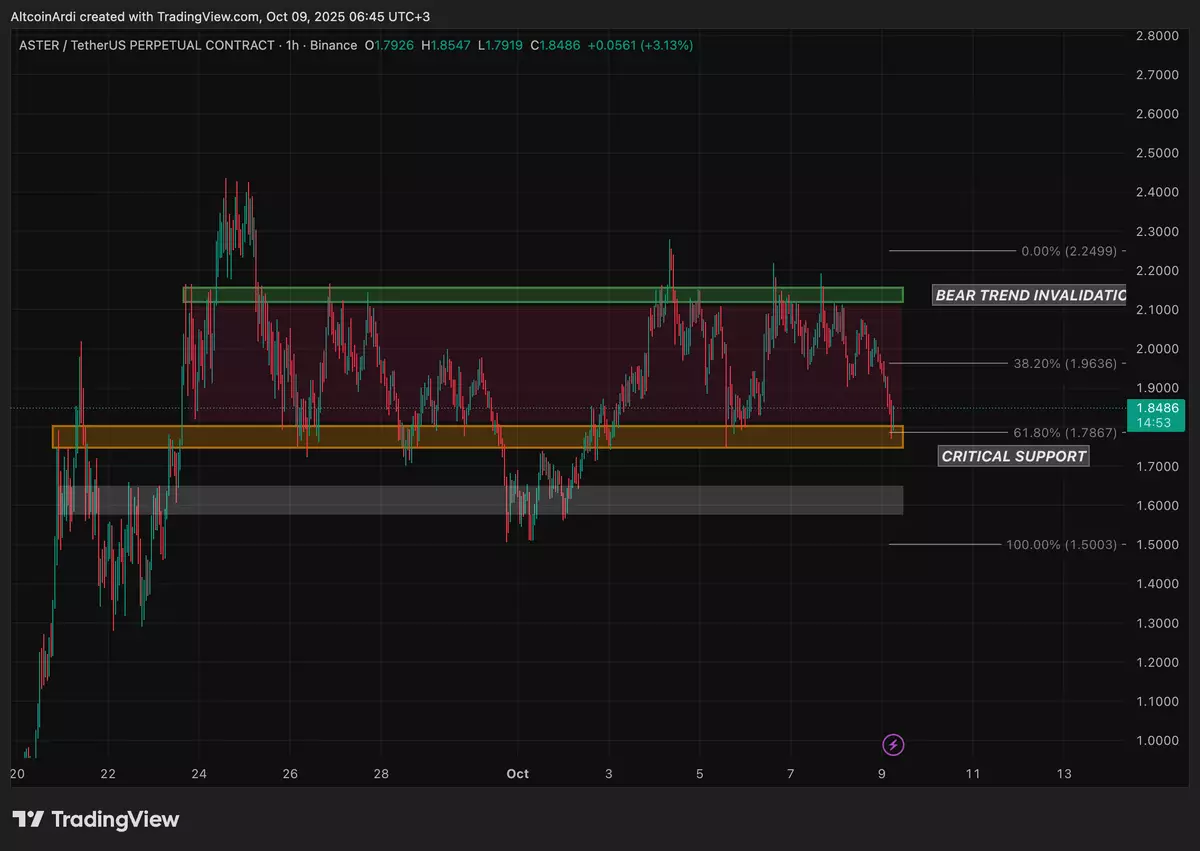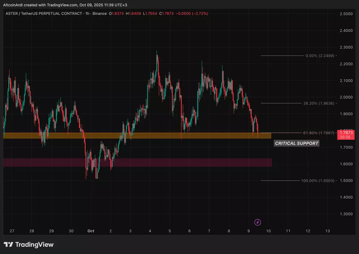 $ASTER back in its critical support zone. Needs to hold above ~$1.75 otherwise a bigger flush down is coming.$ASTER DAILY MARKET UPDATEAster dipped into our critical support zone around ~$1.75 after losing both its ascending trendline and the local ~$1.90 support range we've been tracking. The drop tagged the 61.8% Fibonacci retracement of the $1.50 → $2.27 leg; still considered x.com/AltcoinArdi/st…