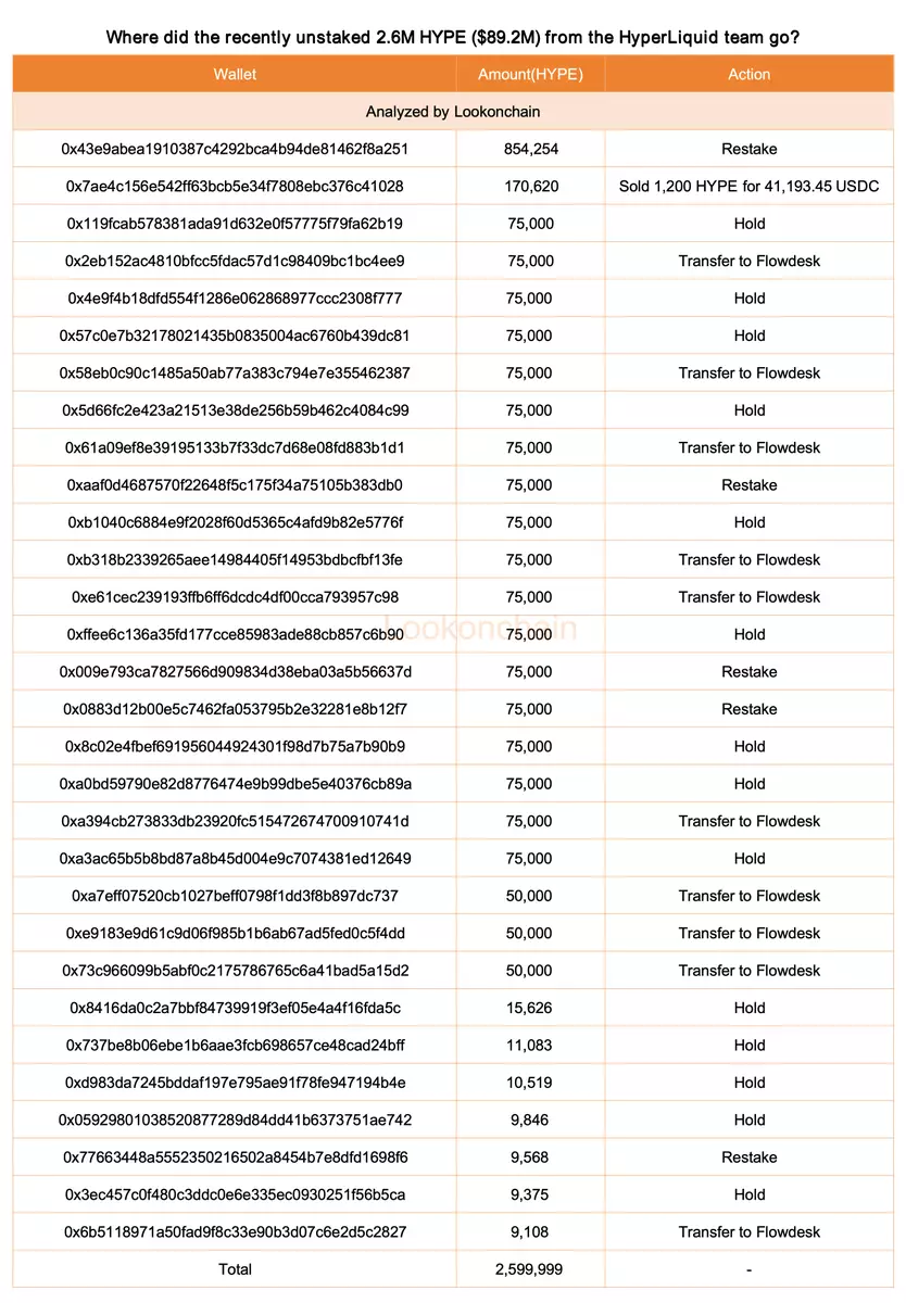 The HyperLiquid team recently unstaked 2.6M $HYPE($89.2M). Of that amount: 1,088,822 $HYPE($37.4M) was restaked; 900,869 $HYPE($30.9M) remains in the wallet; 609,108 $HYPE($20.9M) was sent to #Flowdesk; 1,200 $HYPE was sold for 41,193.45 $USDC. https://hypurrscan.io/address/0x43e9abea1910387c4292bca4b94de81462f8a251…
