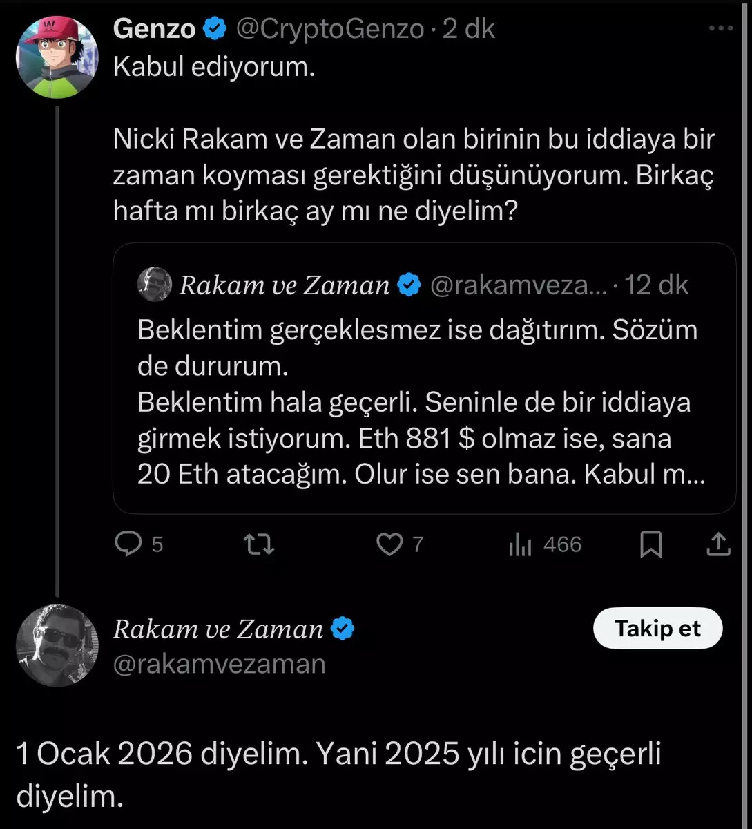 Bugün 1 ocak ve bıyıklı serkanın 881$ iddiası an itibariyle bitti. Elindeki tüm ETH leri 1500$ da satıp 881$ olacak satın ordan alırsınız derken nasıl bu kadar emin konuşuyorsun bence olmayacak demiştim ve iddiaya girmiştik. $ETH 3000$ seviyesinde kapattı ve çok basit bir iddia2025 yılının sonuna kadar $ETH 881$ olmaz ise bu arkadaş bana 20 ETH atacak. Olur ise ben ona 20 ETH atacağım hepiniz şahitsiniz. Kazanmam halinde CT nin gördüğü en büyük hediyelerden birini dağıtacağım