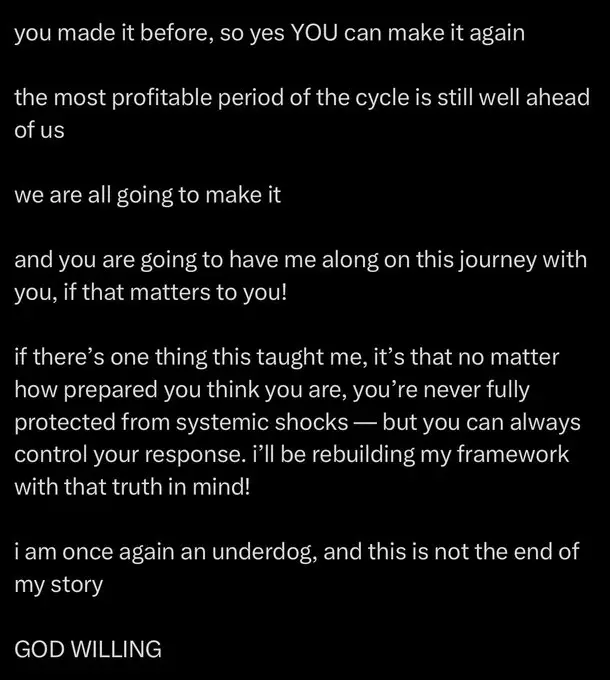 People can laugh all they want but this page really stuck with me. If you made it before you are gonna make it, I got wiped out on all my $aster position and I was angry. Seeing this gives hope come back story would be a nice addition to conviction'the LORD gave, and the LORD hath taken away; blessed be the name of the LORD' — Job 1:21 yesterday's liquidation event is the most brutal i've witnessed in my time in crypto i got wiped out on ALL my perps positions literally everything eight figures: $30 million+ at peak